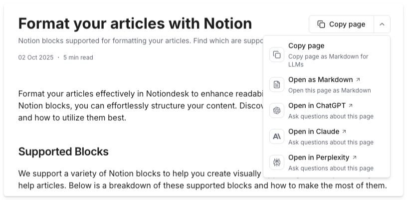 Notiondesk provides a contextual menu on every published page. This menu gives you one-click access to AI-optimized versions of your documentation. With it, you can: